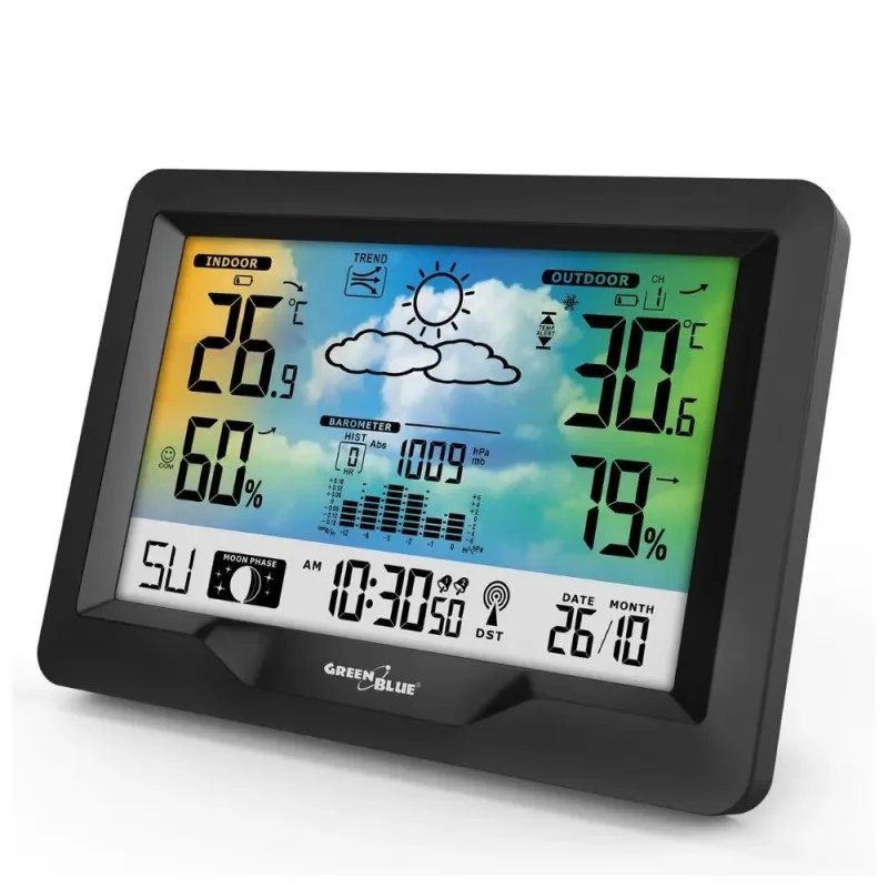 Stacja pogodowa bezprzewodowa GreenBlue GB540N, kolorowa, z systemem DCF, fazy księżyca, barometr, kalendarz, zasilacz z kategorii stacje pogodowe. Gwarancja: 24 mies.