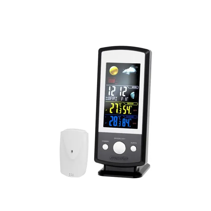 Kolorowy wyświetlacz cyfrowy Wymiary urządzenia: 9,2mx2,8Cmx22,4Cm Odczyt temperatury zewnętrznej i wewnętrznej Odczyt wilgotności zewnętrznej i wewnętrznej Odczyt ciśnienia Prognoza pogody Wyświetlanie cyklu księżyca Wyświetlanie godziny i daty Alarmy 2-czasowe Alerty o 2 temperaturach Wyświetlanie temperatury w stopniach Celsjusza i Fahrenheita 1 sonda zasilana bateryjnie 2xAAA Urządzenie zasilane bateryjne 2xAA i sieciowo 220-240V 50/60Hz