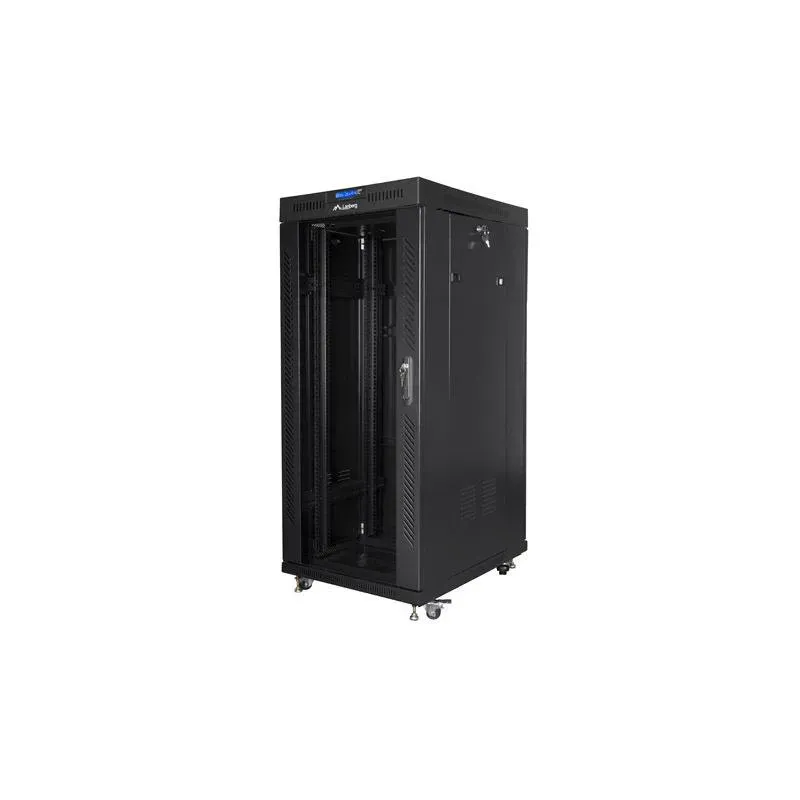 Kolor: Czarny RAL9004, Rodzaj drzwi przednich: Przeszklone Rodzaj drzwi tylnych: Metal Typ drzwi: Jednoskrzydłowe Ilość miejsc na wentylatory: 4 Ilość pionowych szyn: 4 Panel LCD: Tak Klasa szczelności: IP20 Grubość drzwi przednich: 1.2 mm Grubość drzwi tylnych: 1.2 mm Grubość górnego & dolnego panelu: 1.2 mm Grubość bocznego panelu: 1.2 mm Grubość szyn montażowych: 2 mm Grubość ramy: 1.2 mm Grubość pozostałych elementów: 1.2 mm Grubość pozostałych elementów: 1.2 mm Szczegóły uziemienia: Drzwi przednie, Drzwi tylne, Rama Standard: ANSI/EIA RS-310-D DIN 41491/PART 1 DIN 41494/PART 7 ETSI IEC297-2:1982 Akcesoria w zestawie: Kółka z hamulcem Nóżki Panel wentylacyjny (4 wentylatory) Pionowy organizer kabli x2 Śruby M6 Termostat Zamek przedni Zamek tylny Zamki boczne