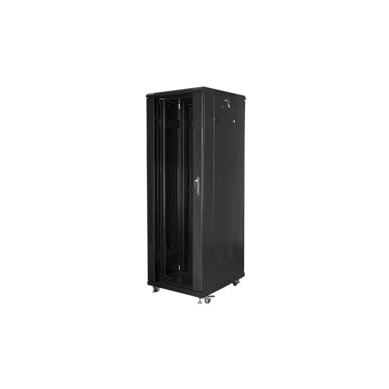 Kolor: Czarny RAL9004 Panel podłogowy: 4 kółka z hamulcem + regulowane nóżki Ładowność: Do 800 KG Klasa szczelności: IP20 Panel wentylacyjny: 4 wentylatory 230V w górnej obudowie Rodzaj drzwi: Przednie - Szyba hartowana, Tylnie - Stalowe Zgodność ze standardami: ANSI/EIA RS-310D, IEC297-2 DIN41494; PART1 & PART7, ETSI Materiał wykonania: Wysokiej jakości stal walcowana, malowana proszkowo Grubość blachy: Profil montażowy - 2,00mm, Reszta - 1,2mm - 1,5mm Otwory kablowe: Góra, Dół (regulowane) W zestawie: Akcesoria do mocowania zamek drzwi przednich i tylnych, dwa zamki paneli bocznych, 20 śrub M6