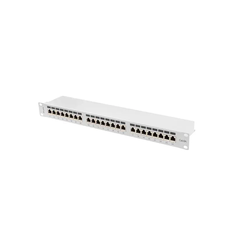 - 24 ekranowane porty RJ-45 kategorii 6a. - Oznaczenia portów w postaci ponumerowanych pól. - Przeznaczony do szaf 19". - Wysokość: 1U. - Półka z uchwytami ułatwiająca montaż i organizację. - Uniwersalne złącza IDC/LSA zgodne z T568A/B. - kabel uziemiający