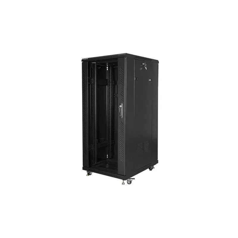 Kolor: Czarny RAL9004 Panel podłogowy: 4 kółka z hamulcem + regulowane nóżki Ładowność: Do 800 KG Klasa szczelności: IP20 Panel wentylacyjny: 4 wentylatory 230V w górnej obudowie Rodzaj drzwi: Przednie - Szyba hartowana, Tylnie - Stalowe Zgodność ze standardami: ANSI/EIA RS-310D, IEC297-2 DIN41494; PART1 & PART7, ETSI Materiał wykonania: Wysokiej jakości stal walcowana, malowana proszkowo Grubość blachy: Profil montażowy - 2,00mm, Reszta - 1,2mm - 1,5mm Otwory kablowe: Góra, Dół (regulowane) W zestawie: Akcesoria do mocowania zamek drzwi przednich i tylnych, dwa zamki paneli bocznych, 20 śrub M6