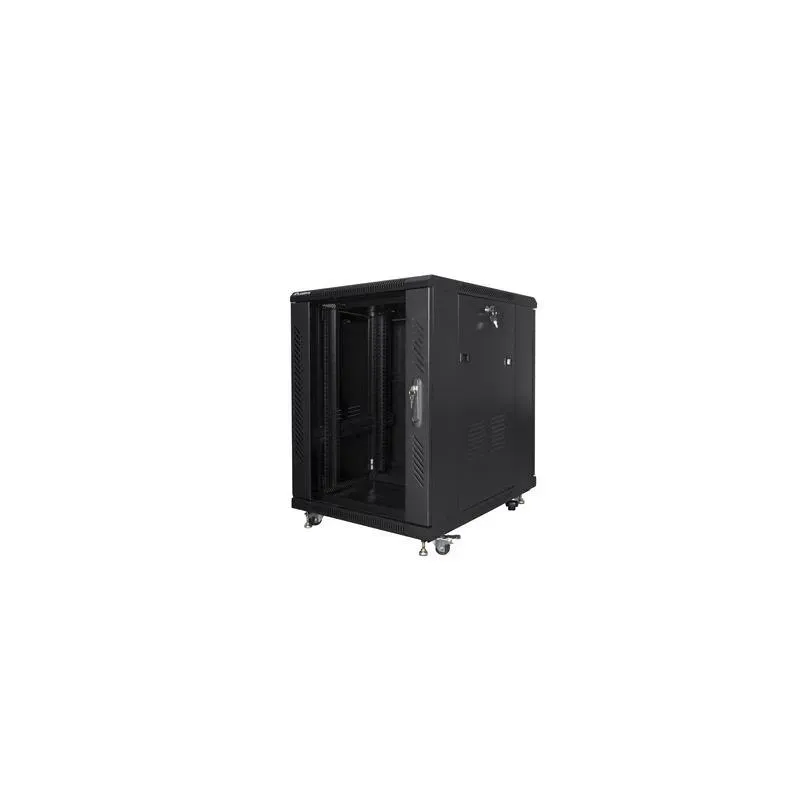 Szafa instalacyjna Rack stojąca 19" 15U 600x800 czarna Lanberg (flat pack). Kolor: Czarny. Zapewnia bezpieczne przechowywanie i organizację sprzętu sieciowego.