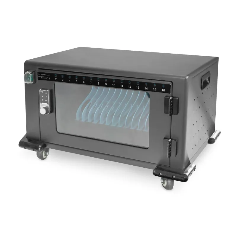 16 półek x (22,1 x 330 x 235mm) na urządzenia do 14" 16 x złącze USB-A (5V, 2,1A) Obsługuje funkcję szybkiego ładowania z mocą do 20W urządzeń Apple, BC1.2 (DCP), HUAWEI-FCP, MTK PE, SAMSUNG-AFC 1 x wentylator (24V) do aktywnego chłodzenia szafy Elektroniczny zamek cyfrowy z kodem PIN Drzwi przednie z kompletnej ramy metalowej ze szkłem bezpiecznym Kąt otwarcia drzwi 180° W zestawie 4 rolki (2 rolki z blokadą) Dołączone uchwyty zapewniające lepszą mobilność Natężenie prądu: 3500W Włącznik/wyłącznik z przodu, przyłącza C20 i USB z tyłu W zestawie: 2x klucz; 1x kabel zasilania; Instrukcja