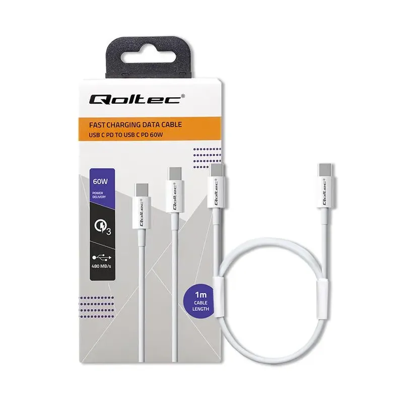 Kabel USB Qoltec 2.0 typ C | USB 2.0 typ C 60W | QC 3.0 | PD | 1m | Biały