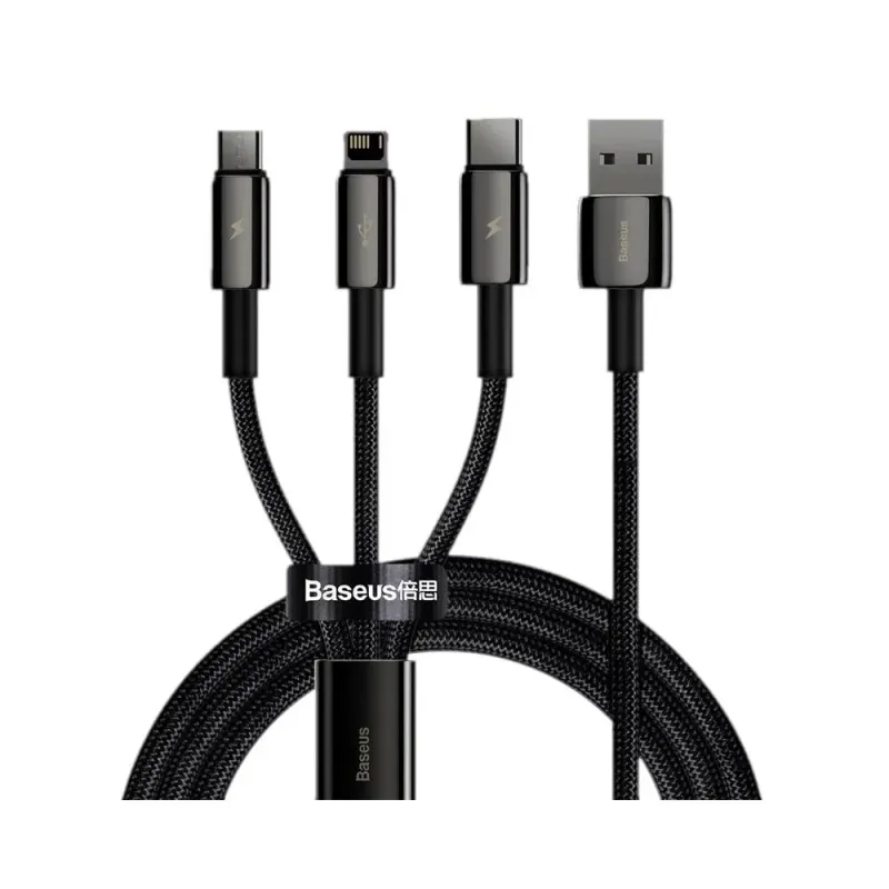 Kabel przewód USB 3w1 - USB-C, Lightning, micro USB 1.5m Baseus Tungsten to kabel USB o długości 1.50 m. Umożliwia podłączenie i transfer danych między urządzeniami.