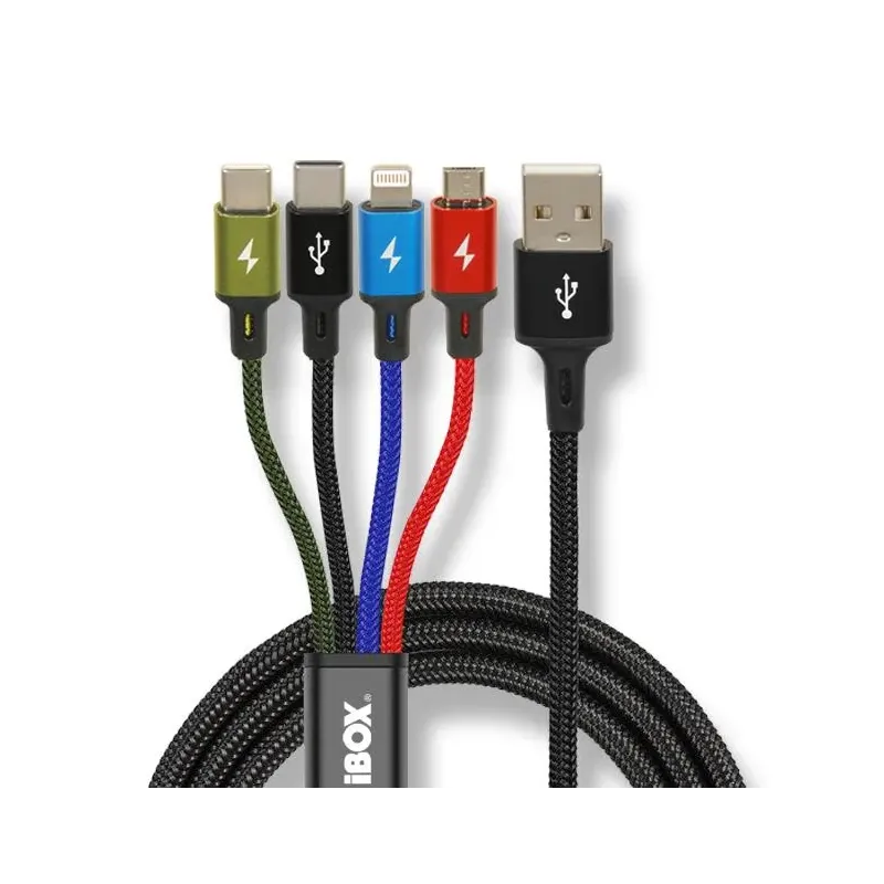 Kabel USB iBOX multi 4w1: 2x USB-C, micro USB, Ligtning - kolorowy to kabel USB o długości 1.20 m. Umożliwia podłączenie i transfer danych między urządzeniami.