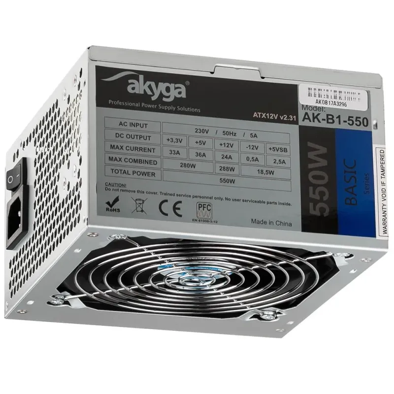 Zasilacz ATX 550W Akyga Basic AK-B1-550 Fan12cm P4 3xSATA PCI-E Zasilacz ATX 550W Akyga Basic AK-B1-550 Fan12cm P4 3xSATA PCI-E to zasilacz komputerowy o mocy 550 W. Zapewnia stabilne zasilanie podzespołów komputera stacjonarnego.