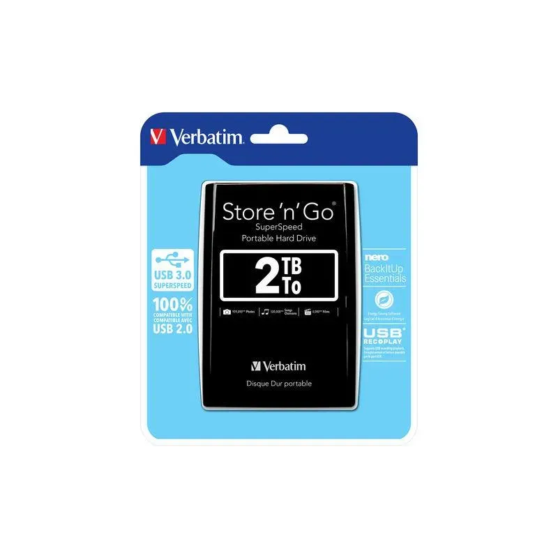 Przenośny dysk twardy Store 'n' Go zapewnia doskonałe osiągi dzięki interfejsowi USB 3.0 „Super Speed”. Interfejs USB 3.0 zapewnia do 10 razy szybszy transfer danych w porównaniu z interfejsem USB 2.0 (w oparciu o szybkość magistrali USB), gwarantując szybki przesył danych w podróży. Przenośny dysk twardy Store n Go korzysta z zasilanego interfejsu USB 3.0 i jest zgodny z każdym portem USB 2.0 dostępnym w komputerach stacjonarnych i przenośnych. Dodatkowe zasilanie nie jest wymagane, dysk wystarczy podłączyć i zacząć z niego korzystać. Zasilanie: Zasilanie z magistrali przez przewód USB 3.0 Interfejs: Porty USB 3.0/2.0 Szybkość przesyłania danych: do 480 Mbitów/sekundę -prędkość magistrali USB Prędkość obrotowa: 5400 obr./min Bufor: 8 MB lub większy Zawartość opakowania: Dysk twardy Store 'n' Go Portable Hard Drive USB 3.0 Kabel USB 3.0 Poradnik wprowadzający Instrukcja obsługi (dołączona na dysku twardym) Oprogramowanie Nero BackItUp Essentials (zainstalowane na dysku twardym) Oprogramowanie Green Button Energy Saving (zainstalowane na dysku twardym) Oprogramowanie do formatowania (zainstalowane na dysku twardym) Oprogramowanie do wymazywania (zainstalowane na dysku twardym)